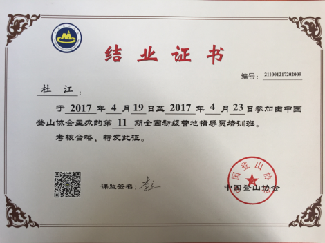 中国登山协会于2017年4月19日-23日在沈阳市白清寨滑雪场举办2017年全国初级营地指导员培训班。社会体育学院社会学教研室杜江老师参加本次培训,经过五天紧张的培训与学习,通过严格的实际操作与理论考核,获得初级营地指导员资格证书。该证书是从事青少年户外营地工作的资格证书,是营地申请国家营地等级的必备证书,同时也是承办全国各类青少年营地活动、赛事的先决条件。