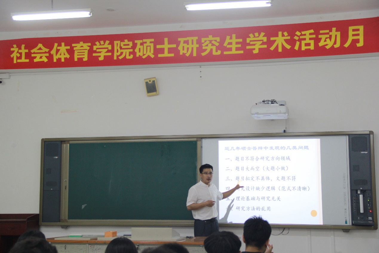 社会体育学院为提升硕士研究生的科研能力和学术论文的写作水平,在研究生学术活动月中举办了一系列的学术讲座。2019年6月28日,社会体育学院邀请休闲运动教研室方海明博士在教学楼115教室为研究生做了题为“研究生阶段如何选题、做研究设计和研究方法甄选”的讲座。