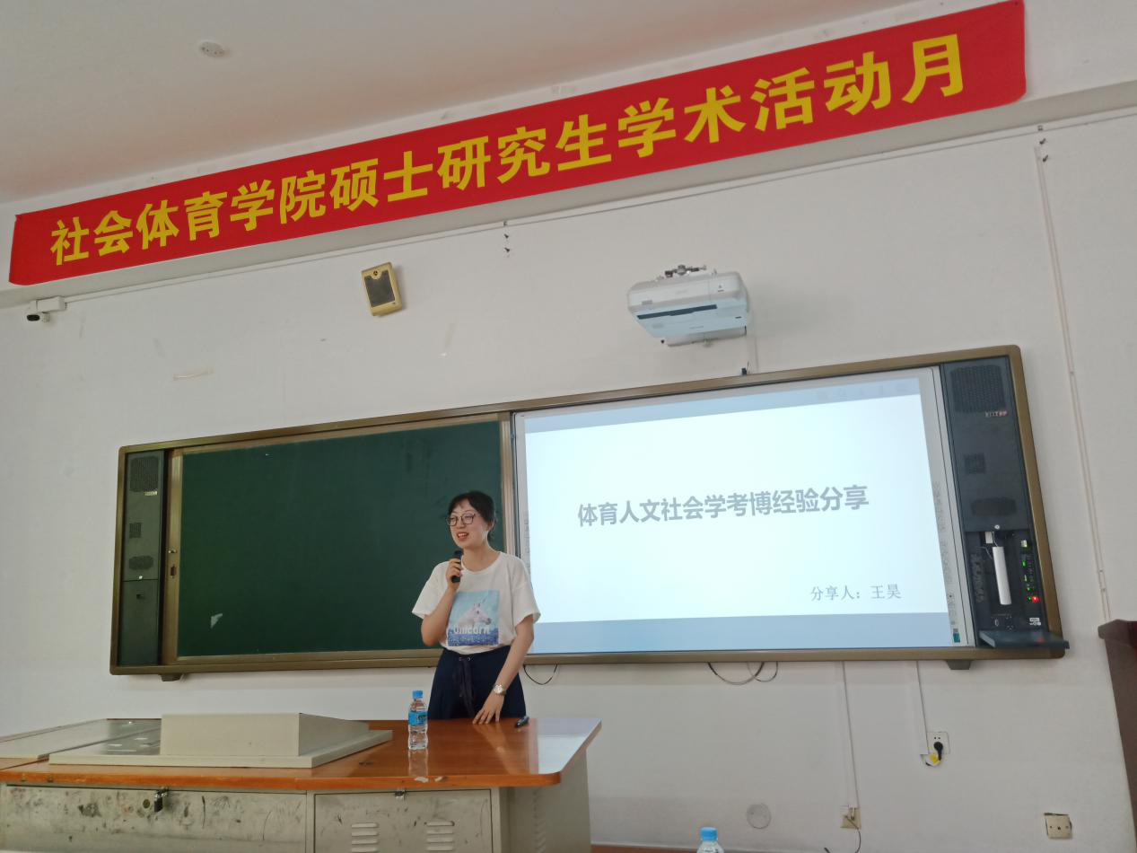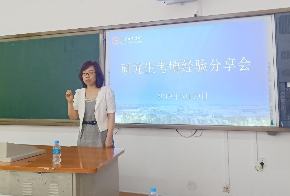 为培养社会体育学院硕士研究生学术素养,活跃研究生学术氛围,提高研究生培养质量,社会体育学院举办硕士研究生学术活动月系列活动,6月19日下午,在教学楼115教室召开研究生考博经验分享会,邀请到2016级体育新闻传播学席小惠和2013级体育管理学王昊做分享,本次分享会由社会体育学院副院长冯欣欣教授主持,社会体育学院2018级全体研究生参加。