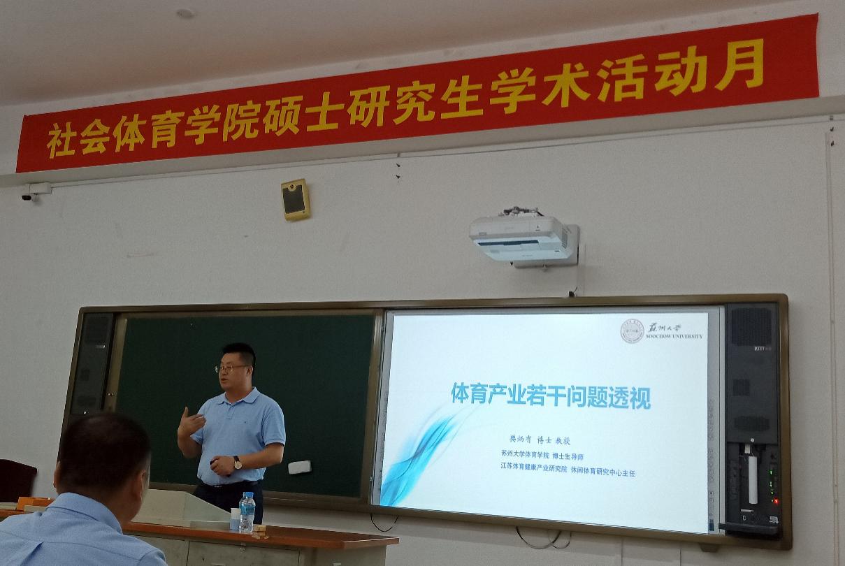 6月21日上午,社会体育学院在教学楼115教室开展硕士研究生学术活动月第二次专题讲座活动。本次讲座特邀苏州大学樊炳有教授为研究生作“体育产业若干问题透视”专题讲座,休闲体育导师组组长徐通博士主持,社会体育学院部分教师及2018级全体研究生听取了讲座。