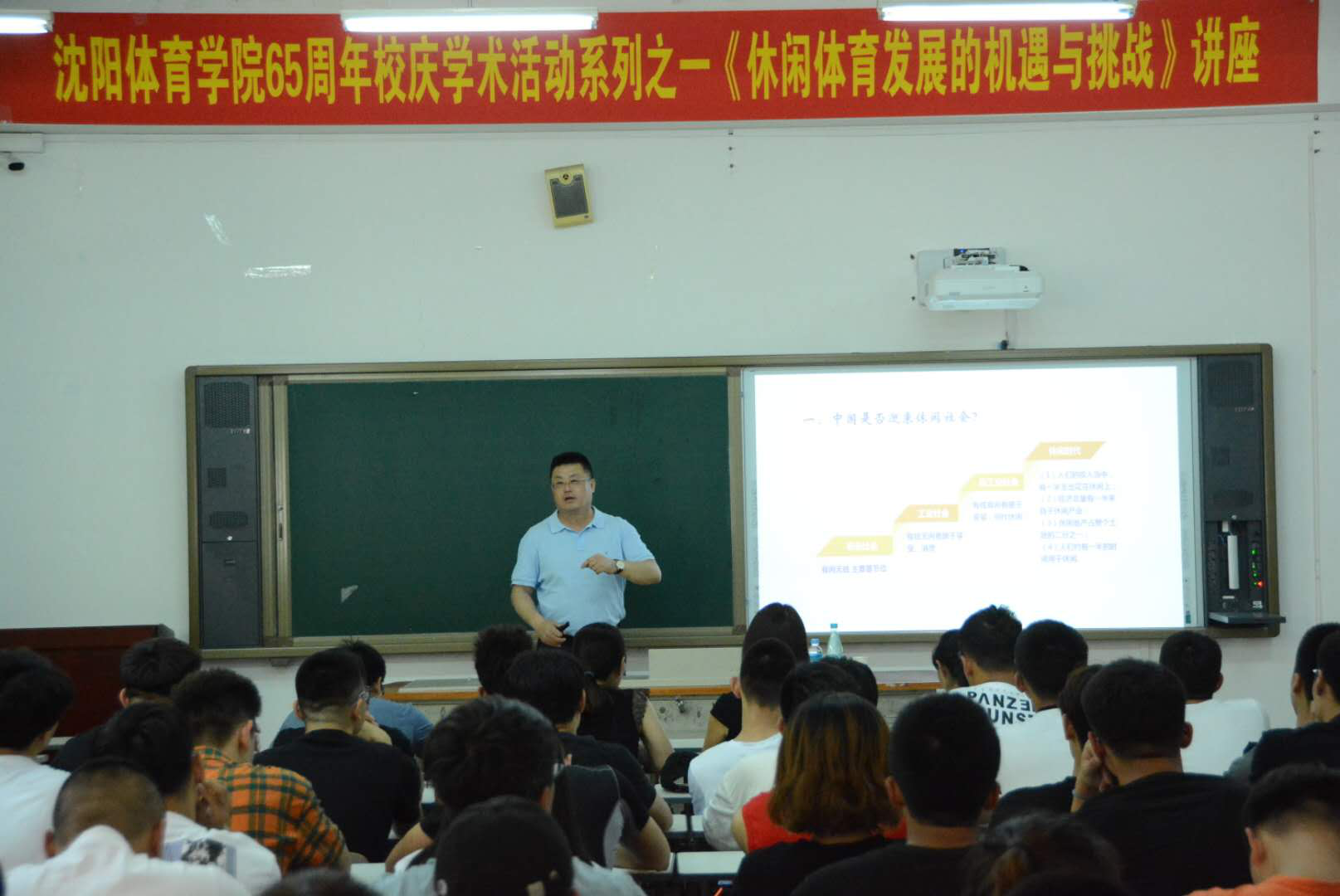 樊炳有教授介绍了自己持之以恒的博士求学之路,以自己的亲身经历鼓励师生要坚持自己的梦想。樊教授从“中国是否迎来休闲社会”、“我们离休闲生活有多远”、“休闲体育面临的机遇”和“休闲体育面临的挑战”四个方面进行了细致阐述,运用大量数据和案例详细讲解了马斯洛需求层次跃迁,从偏好、制约、参与三个维度介绍了中国人休闲观所受的多重制约以及休闲产业目前的四大瓶颈,并提出“体育旅游发展前景巨大,2030年中国将迎来休闲经济时代”的学术观点。
