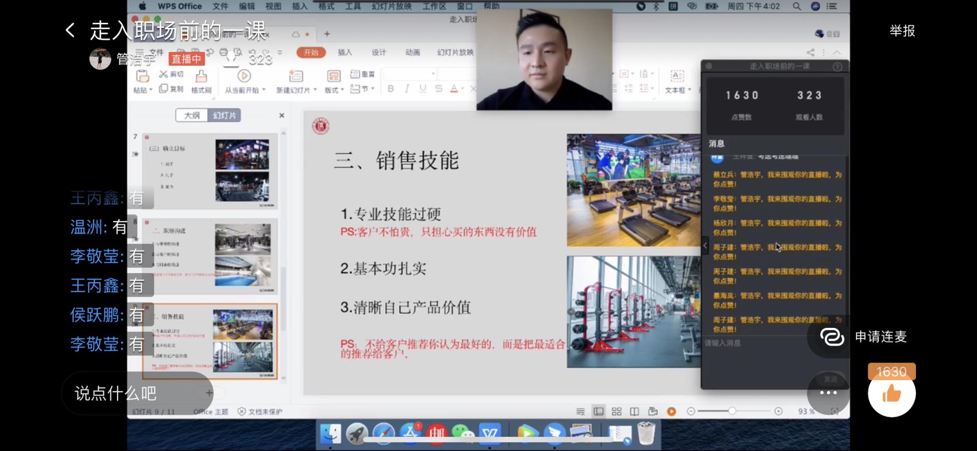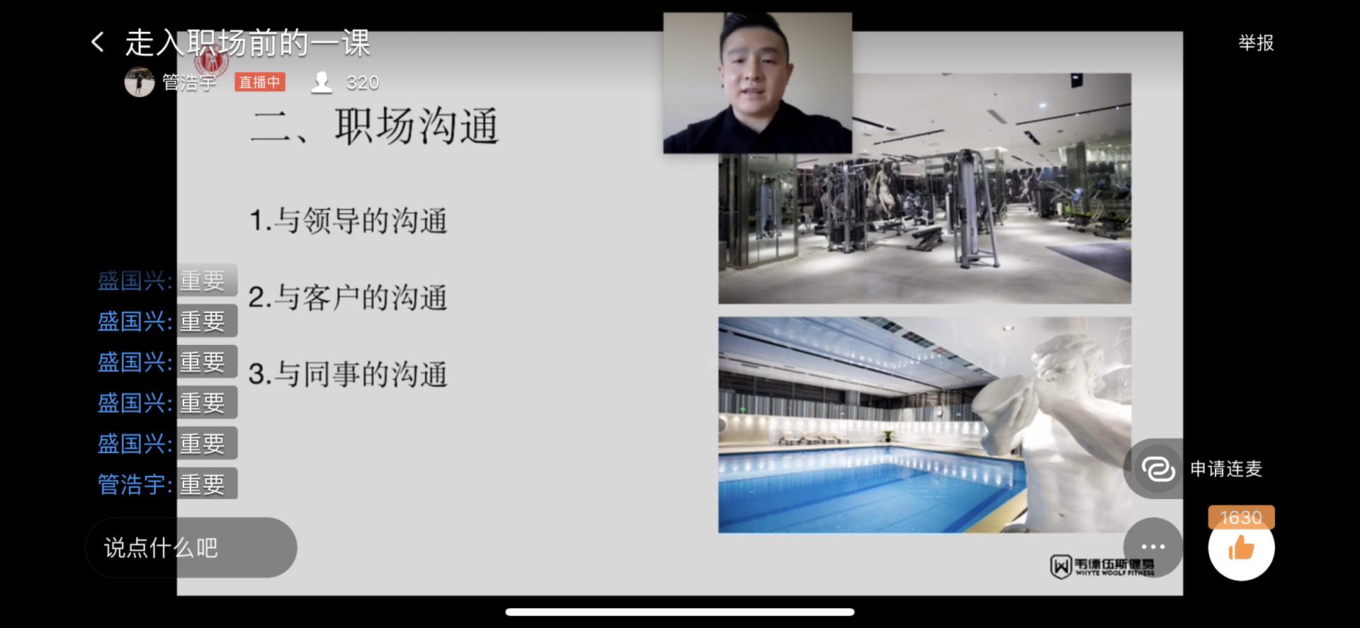 3月19日,社会体育学院为2017级全体学生举办“走入职场前的一课”实习培训讲座,本次讲座邀请到社会体育学院2017届毕业生、韦德伍斯天津恒隆店店长高洪臣为学生进行实习培训。本次讲座继续采用钉钉群直播为方式开展。