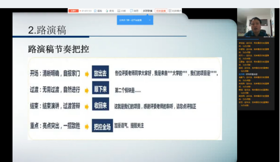 赵乐发围绕“认识创新创业大赛、赛前准备、现场展示”三个方面,为大家系统介绍了非体类竞赛种类,详细讲解了项目选择、团队组建、创业计划书撰写等内容,他还对项目路演的相关技巧展开分析,全面展现了竞赛过程的全貌。培训过程深入浅出,在线师生反响热烈,在讨论区踊跃交流并提出问题,赵老师一一耐心解答。