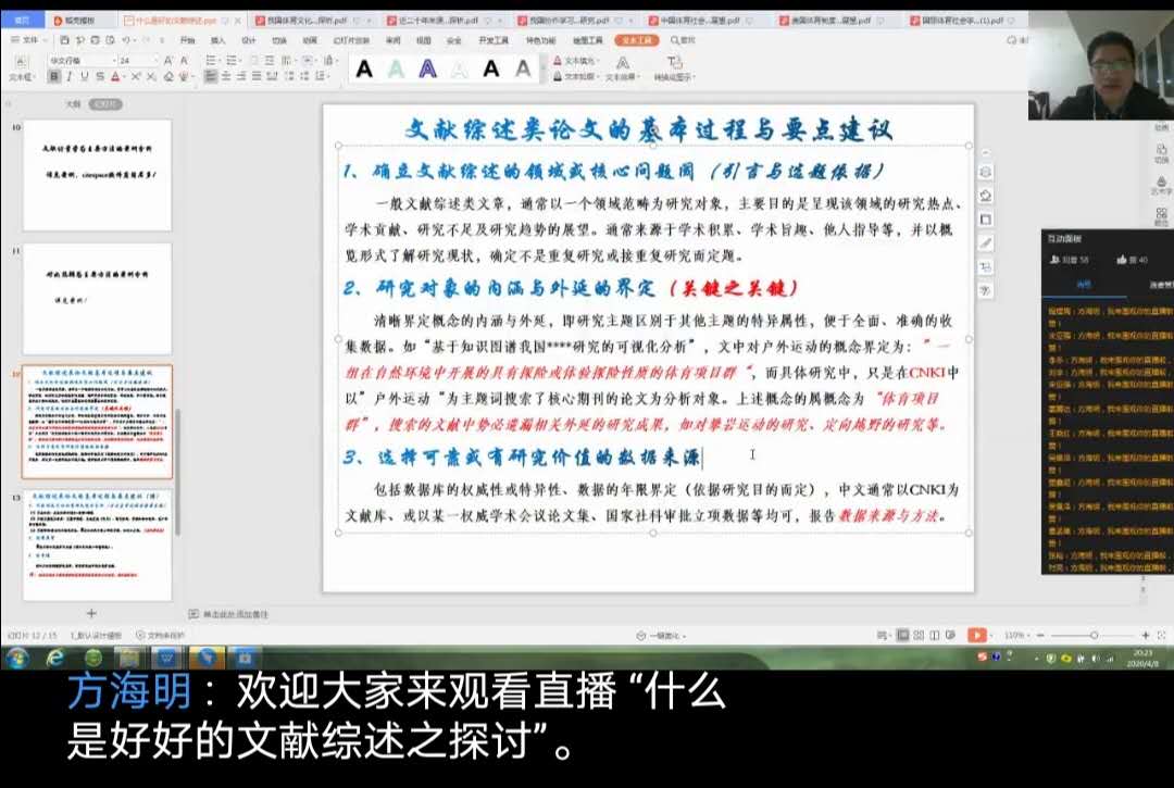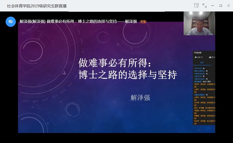 2020年4月2日-25日,社会体育学院在第一期“停课不停学”研究生线上讲座收到良好效果的基础上继续开展了第二期线上系列讲座活动,主讲人分别是解泽强、方海明、徐通、张赫、朴勇慧等5位博士,主题分别是做难事必有所得、什么是好的文献综述、如何做好开题设计、体育教师教育改革的专业化进程、体育赛事网络营销,讲座依然通过钉钉平台以直播的方式进行,共计400余人次参与了活动