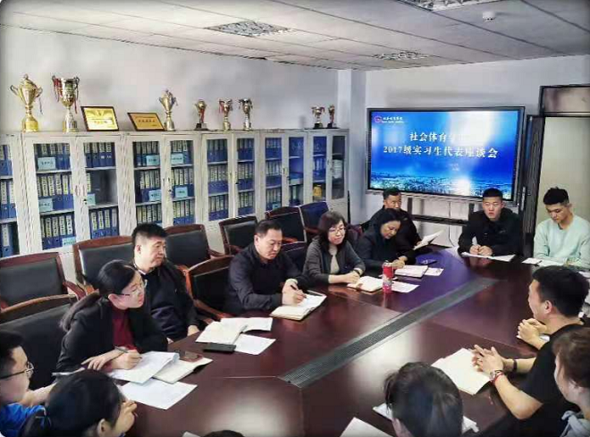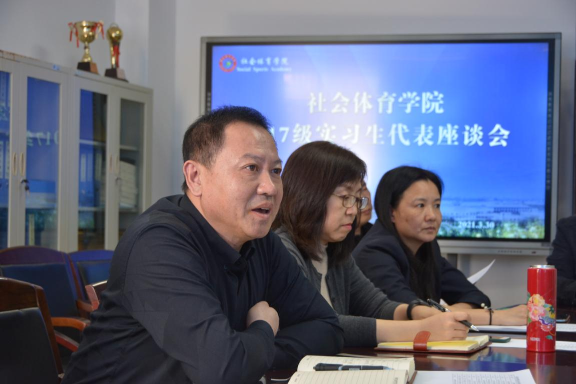 为深入了解学生实习情况,掌握实习生在实习期间的表现,加强学校对实习单位的全方位了解,规范社会体育学院实习管理工作,促进学院人才培养质量的提升,3月30日下午,社会体育学院在游泳馆二楼会议室召开了2017级实习生代表座谈会。出席此次会议的有学校党委常委、社会体育学院党总支书记刘丙权、社会体育学院院长冯欣欣、副书记赵宁、副院长勾庆华、社会体育学院办公室主任杨洁、游泳教研室主任李新、2017级辅导员刘畅以及2017级实习生代表,会议由办公室主任杨洁主持。