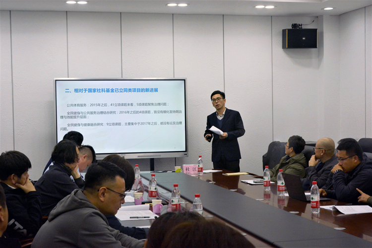 杜江博士从选题依据、同类进展、研究内容、推进计划、研究难点等方面进行了汇报。与会专家从研究对象明晰化,思维逻辑合理化,研究操作可行性,以及研究重点难点攻破等方面提出指导建议,并就研究思路和方法以及一些具体的问题提出了建设性的意见。课题组成员表示将以专家的宝贵意见为指导,进一步深化研究,通过和课题组成员的通力协作,高效优质地完成课题研究任务,为全民健身事业的发展做出积极贡献。