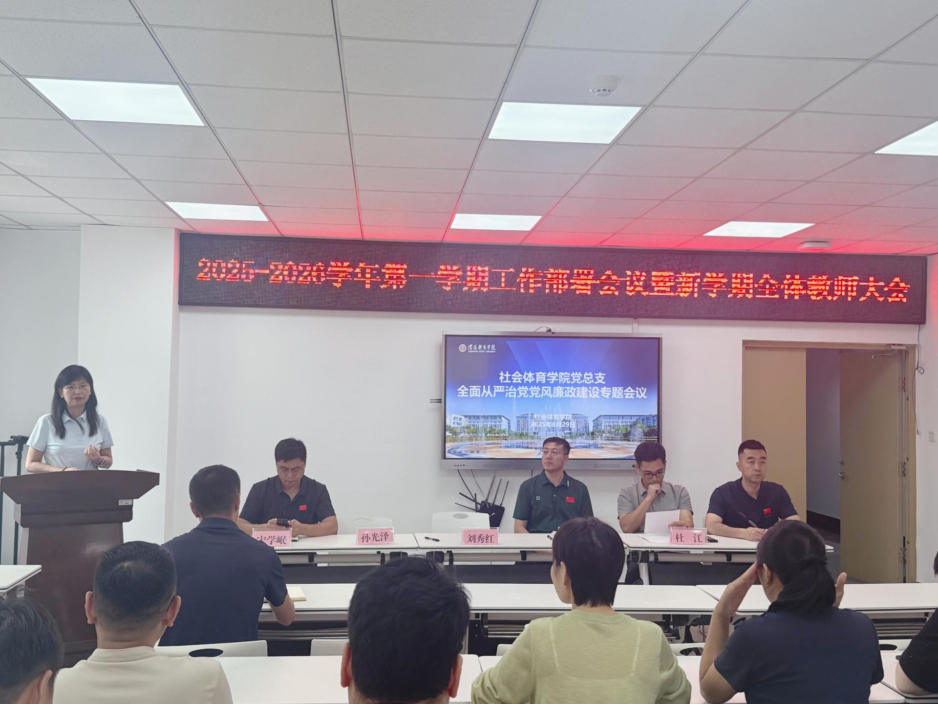 8月29日,社会体育学院在游泳馆二楼大会议室召开全面从严治党工作会议,全体教职工参加,会议由党总支书记刘秀红主持。