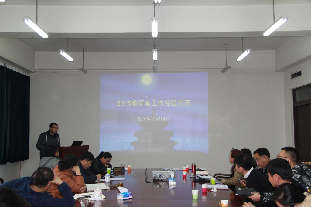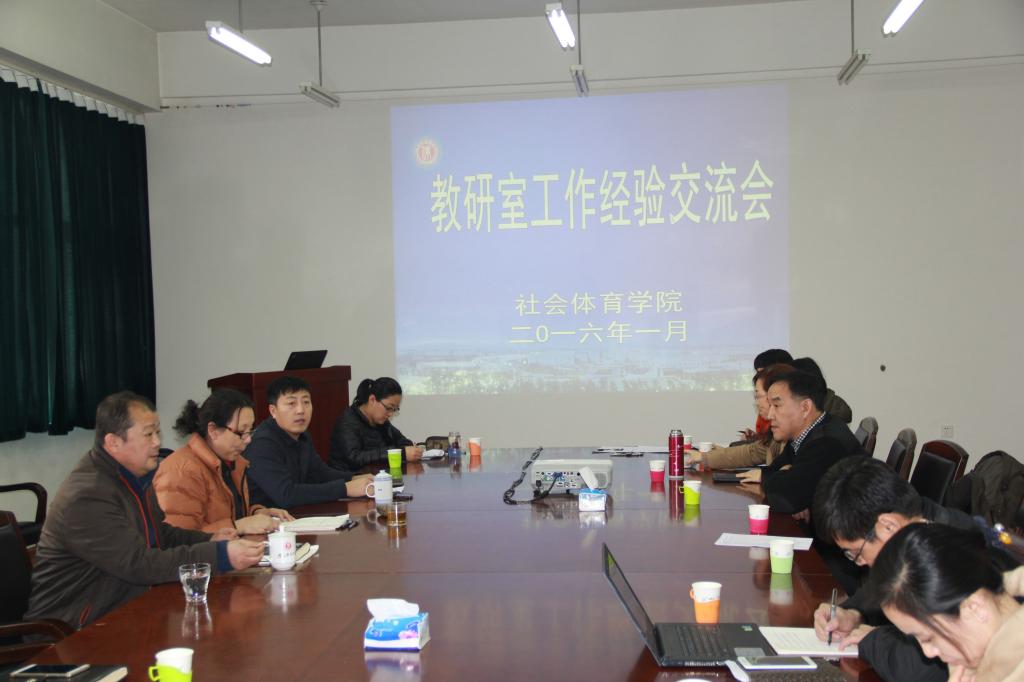 为加强教研室规范管理,按照2015-2016学年第一学期工作计划安排,1月21日,社会体育学院在科技楼二楼会议室组织召开了2015年度教研室工作经验交流会,会议由副院长邹本旭主持,社会体育学院曹继红院长、樊占平书记、刘秀红副书记及全体教师参加会议。