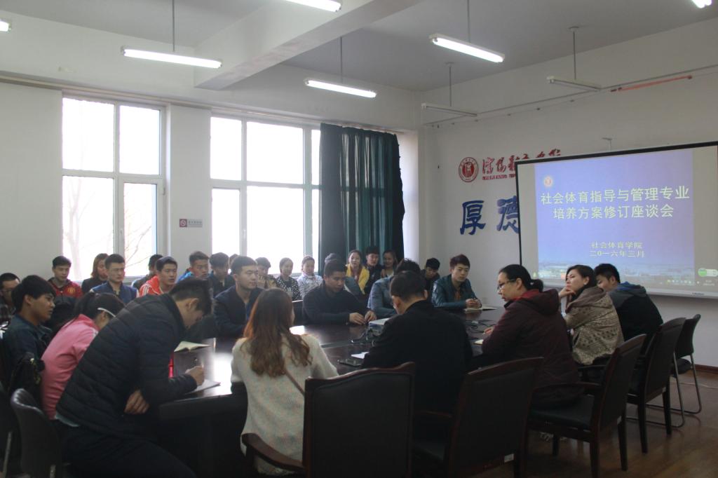 3月30日,在科技楼二楼会议室,社会体育学院组织召开了社会体育指导与管理专业培养方案修订征求意见座谈会,社会体育学院院长、社会体育指导与管理专业带头人曹继红教授主持会议,社会体育学院校企合作办公室主任高观福及社会体育专业2012级30名学生参加座谈。