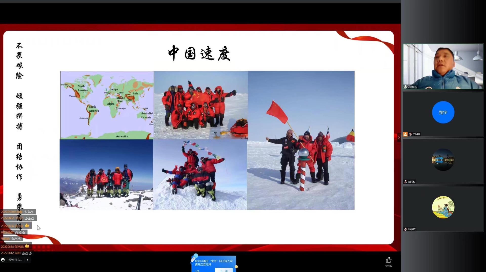 次落队长分别从中国高度、中国决心、中国速度、中国声音、中国力量五个方面全面讲述了中国登山队的建立过程。并分享了许多有关攀登者的体验以及攀登过程中默默付出的事迹。随后次落队长用一段珍贵的视频展现了中国登山队的以往所获的成就,证明了中国登山队坚定的决心、前进的动力和光辉的历史,表达出了中国登山队的强大信念:“请党放心,祖国有我”。