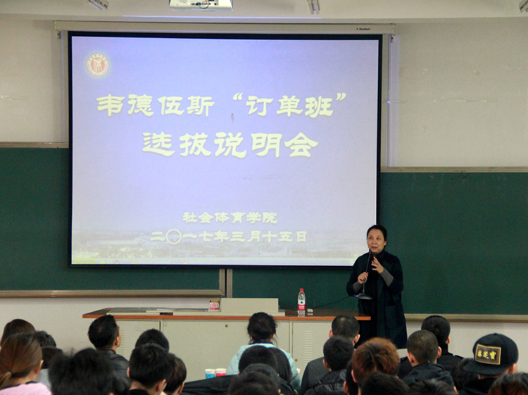 为进一步深化校企合作,增强本专业的社会竞争力,从培养服务学生的角度出发,帮助学生做好职业规划,实现人生价值,解决学生的就业出路,实现我院新一轮校企合作的深入探索。社会体育学院2015级于2017年3月15日,在教学楼211教室,召开了韦德伍斯“订单班”选拔说明会,韦德伍斯董事长助理高观福先生,副总kevin先生,王娉女士,大区经理孙鹏先生以及随行人员参加了本次说明会,本次说明会得到了院领导的高度重视,院长曹继红教授,副院长宛霞教授,副书记赵宁,院办公室主任杨洁出席了本次活动。