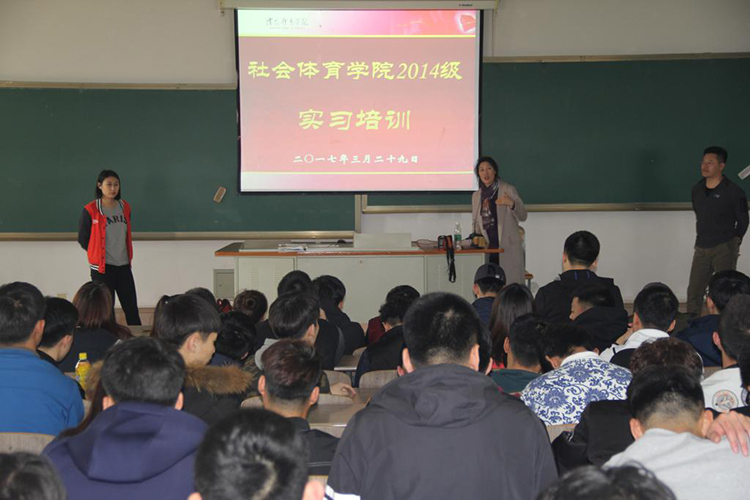 3月29日下午,在教学楼311教室进行了社会体育学院2014级“从市场角度看户外产业的人才需求”的实习培训,2014级辅导员吴可佳、14级全体学生参加此次会议,会议由社会体育学院副院长宛霞主持,培训主讲是北京天人际体验教育集团培训总监郭艳鹏老师。