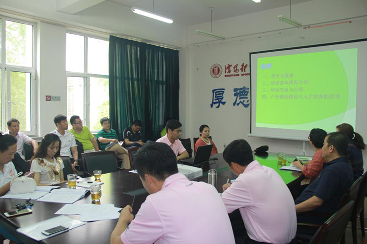 户外运动教研室宋学岷就参加青少年户外营地管理人员培训、全国户外营地指导员师资师资培训心得体会;孙永生就参加户外教育师岗位培训;方海明就参加野外医学高级急救课程(WAFA )学习体会;高尔夫教研室赵全斌就参加2016年中国高尔夫球协会中级教练员培训向全体教师进行了汇报。